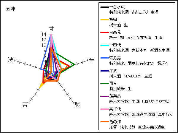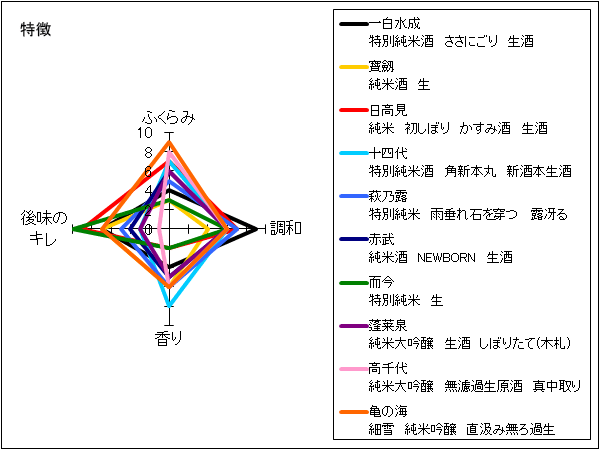 酒泉洞堀一、知多繁 | ごく薄い黄緑色の酒色。バナナ、ライチ、青リンゴの香りがある。しっかりした甘味と酸味、旨味があり、芳醇な飲み口。辛味もしっかりしているので意外とスッキリ楽しめる。甘すぎるという意見も。 | 5 |