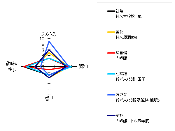 やすだや | ほぼ透明な酒色。ごくわずかにブドウ、パインの香りがある。僅かに甘味があり、透明感を感じる酒質。あっさり、さらっとしながら苦味をしっかり感じさせながら切れていく。バランスよく爽やかだが、ややあっさりしすぎている印象。 | 3 |