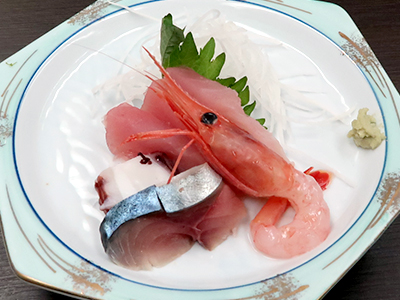 肴はお刺身盛り合わせからスタート。マグロ、タコ、鯖、甘エビ。