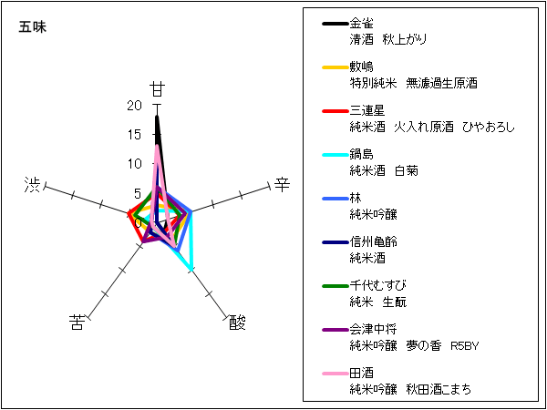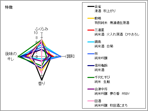 調査中 | ごく薄い黄緑色の酒色。微かに麹の香りがある。良質な甘味を中心に突出したところはなく、やさしくさっぱり。コク感は少なく、余韻も短い。飲み飽きない、燗で楽しみたいという意見の一方で水っぽいという意見も。 | 5 |