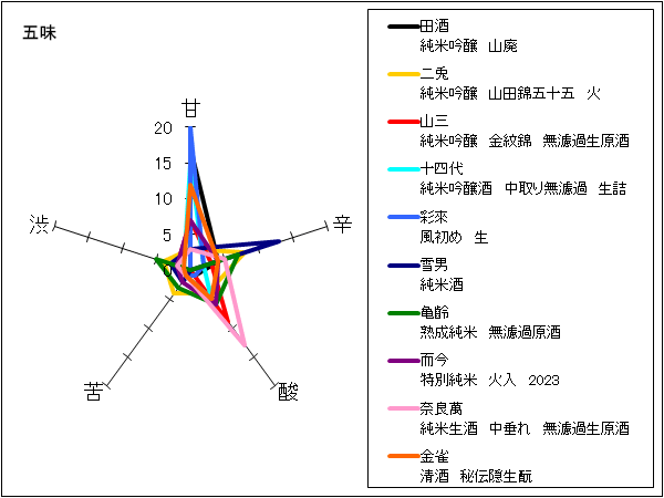 酒泉洞堀一 | 透明の酒色。洋梨、ライチ、リンゴの香りがある。さっぱりした甘味と酸味のバランスが良い。鋭い辛味が味を引きしめ、爽やかに味をまとめる。軽いつまみにあいそう。 | 8 |