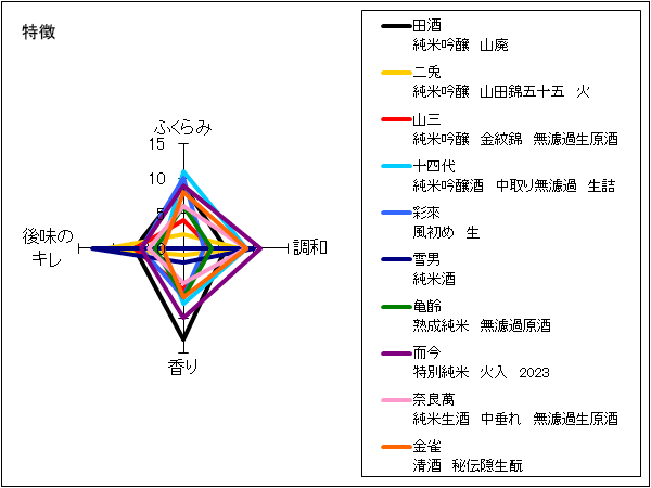 酒の岡田屋 | ごく薄い黄金色の酒色。微かに甘い香りがある。辛味が強くドライでさっぱりした飲み口。苦味は少なく水のようにさらりと消えていく。料理の邪魔をしないという意見の一方で味がない、水っぽいという意見も。 | 6 |