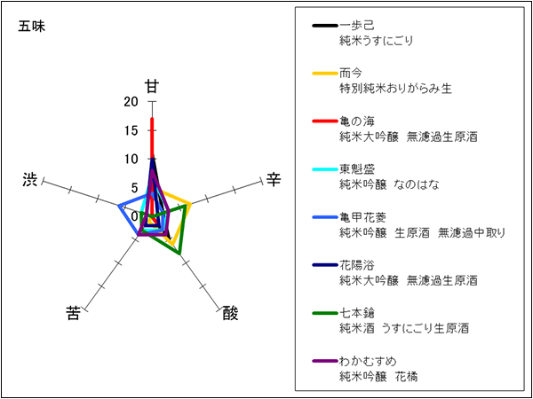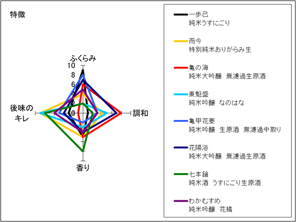 丸内酒食品、秋貞商店 | ごく薄い黄緑色の酒色。フルーティな香り、しっかりした甘味があり、甘い果実を思わせる。ピリッとした辛味もあり、単純な味わいには陥らない。最後は甘味の余韻がじんわり消えていく。甘味が重く飲み疲れるという意見も。 | 3 |