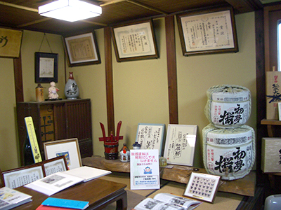 さかばやしと暖簾をくぐり中に入る、右側が銘柄の展示コーナー、真ん中に新酒の搾りたて、試飲用テーブル、その奥は和机の置いてある畳敷きの小上がりになっており、数々の表彰状、初夢桜の薦樽が展示され、華やかである。和机の上には伊勢湾台風当時の罹災写真のアルバムが置いてある、大変な被害状況である。
